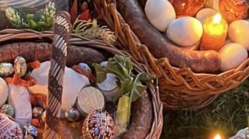 Старі люди кажуть, що колись до церкви несли 7 продуктів, обов’язкових для освячування: паску, крашанки, запечений сир, ковбасу, сало, вершкове масло, сіль.