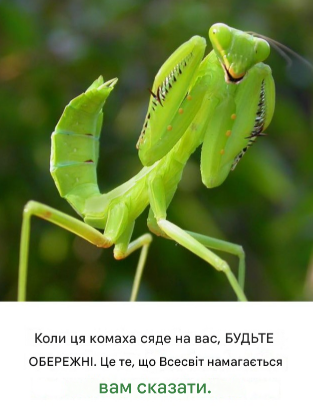 Богомол, який щойно приземлився, — це послання від тих, хто зверху, що вони можуть наслати вам серйозну хворобу, якщо ви не почнете піклуватися про своє тіло.